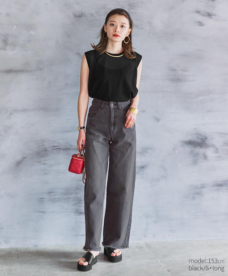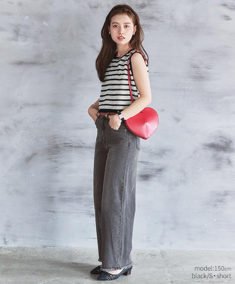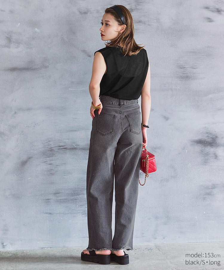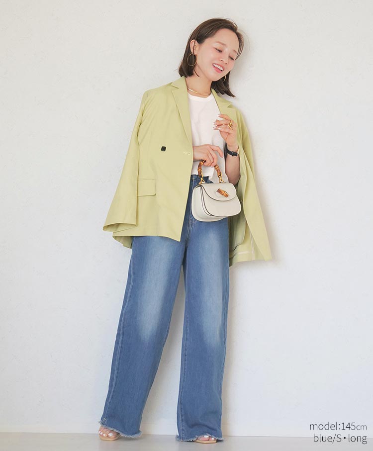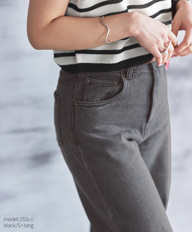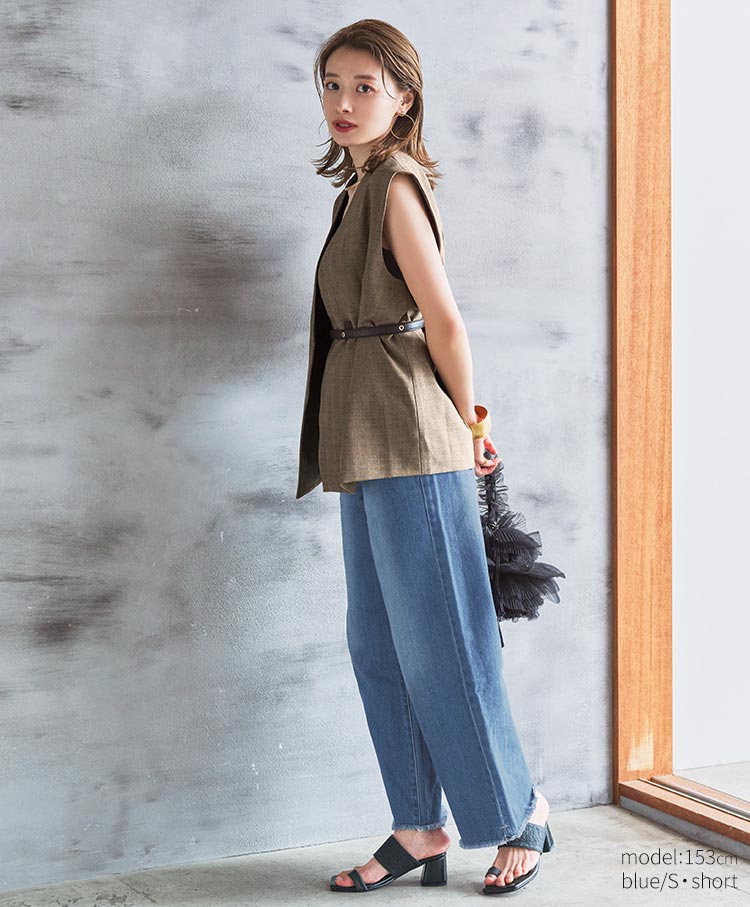 シルエットにこだわった美脚デニムです。腰まわりはハイウエストでキープしつつも、裾にかけて足がまっすぐ長く見えるワイドなストレートシルエットです。ベーシックコーデからきれいめまで、幅広いテイストに馴染むベーシックなデザインです。Tシャツやジャケットなどで合わせるだけで、女性らしさを兼ね備えた都会的スタイリングが出来上がります。シーズン問わずに長く活躍する万能アイテムです。