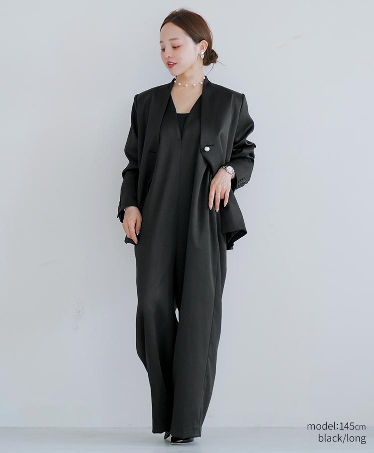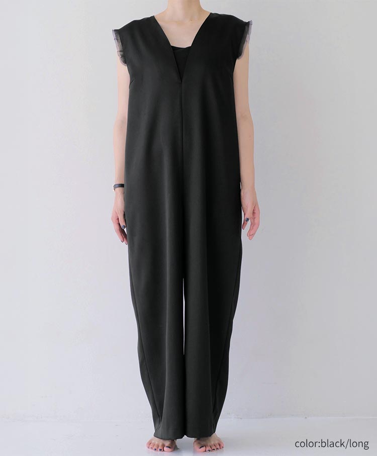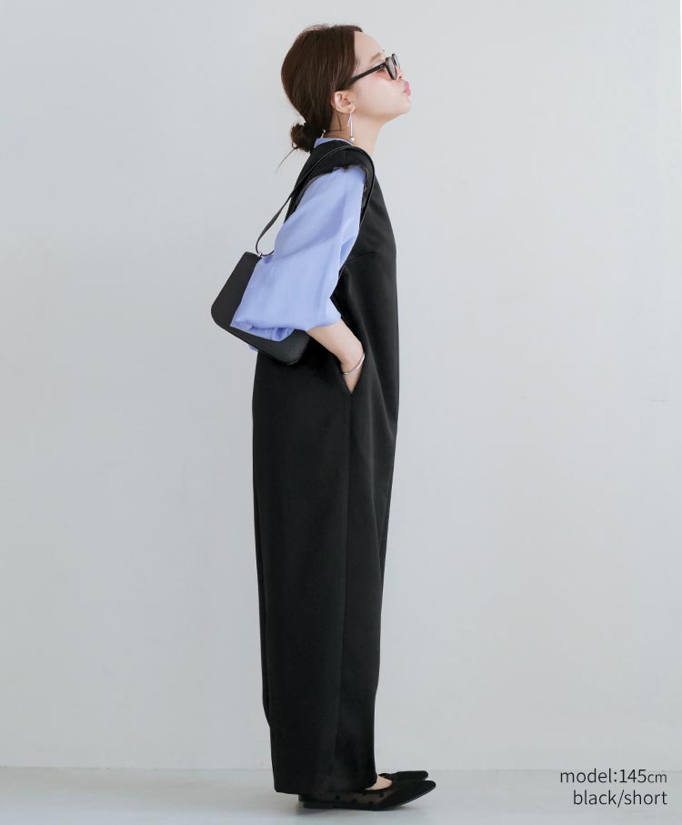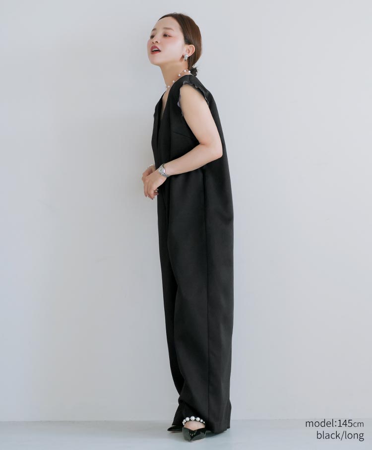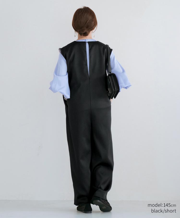 無駄を削ぎ落としたミニマルなデザインが魅力のサテンワイドシルエット・コンビネゾン。