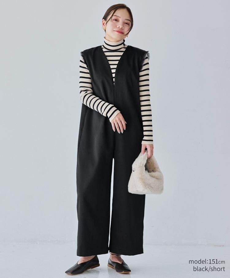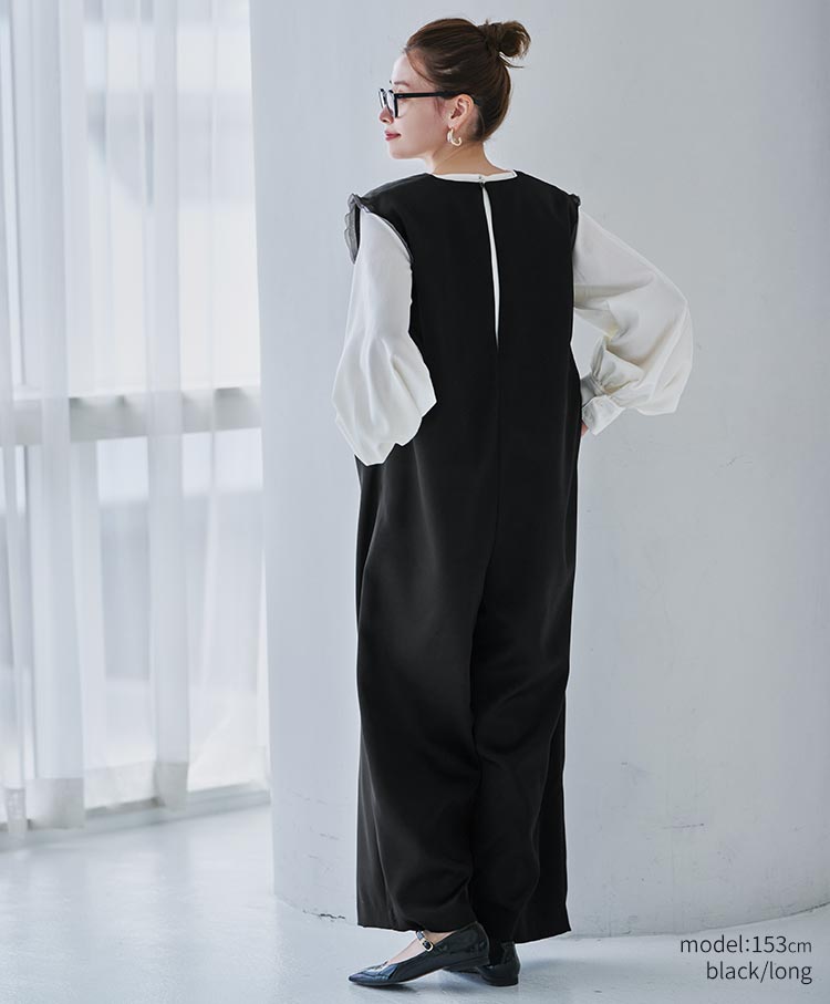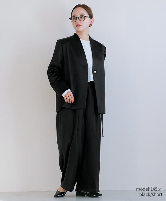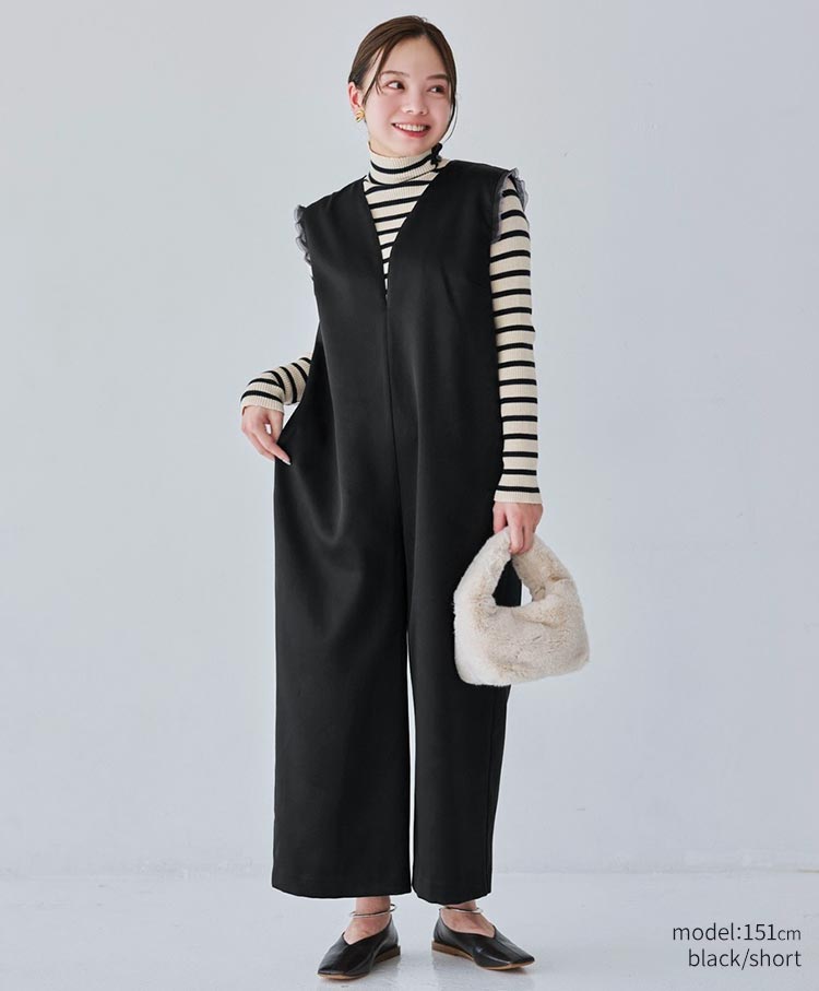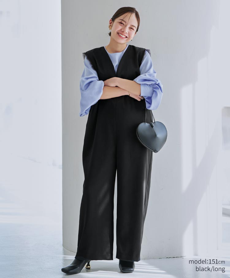 無駄を削ぎ落としたミニマルなデザインが魅力のサテンワイドシルエット・コンビネゾン。